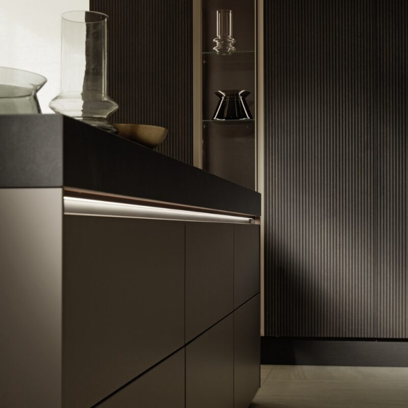 The neoLodge’s matte lacquered veneer goes around the edges for a uniform look. Its MatrixArt One option gives you a single handle trim profile below the worktop, which can be illuminated for that dramatic touch. And you can combine with the MatrixZero for push-to-open fronts that make your kitchen as easy to use as it is beautiful to look at.