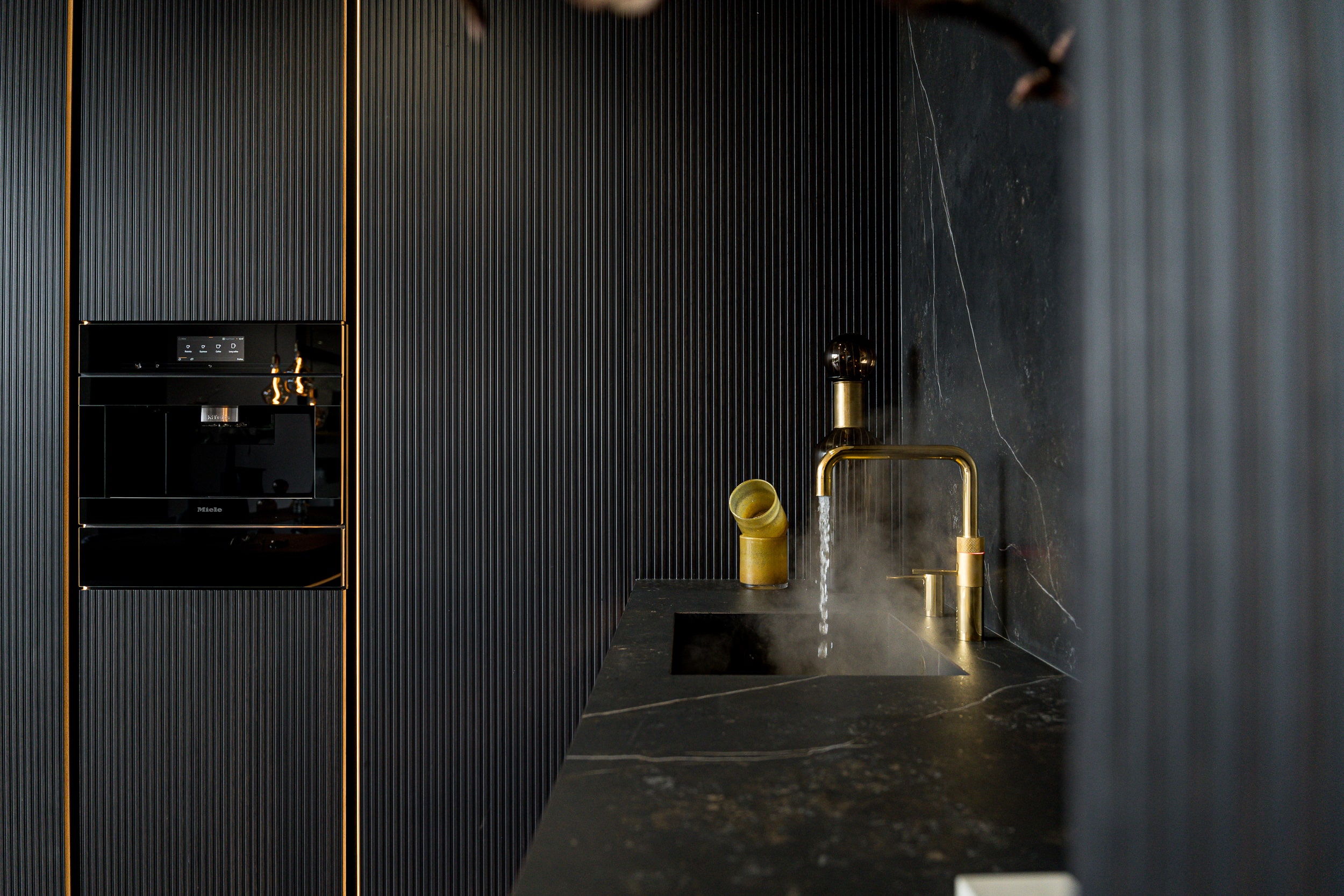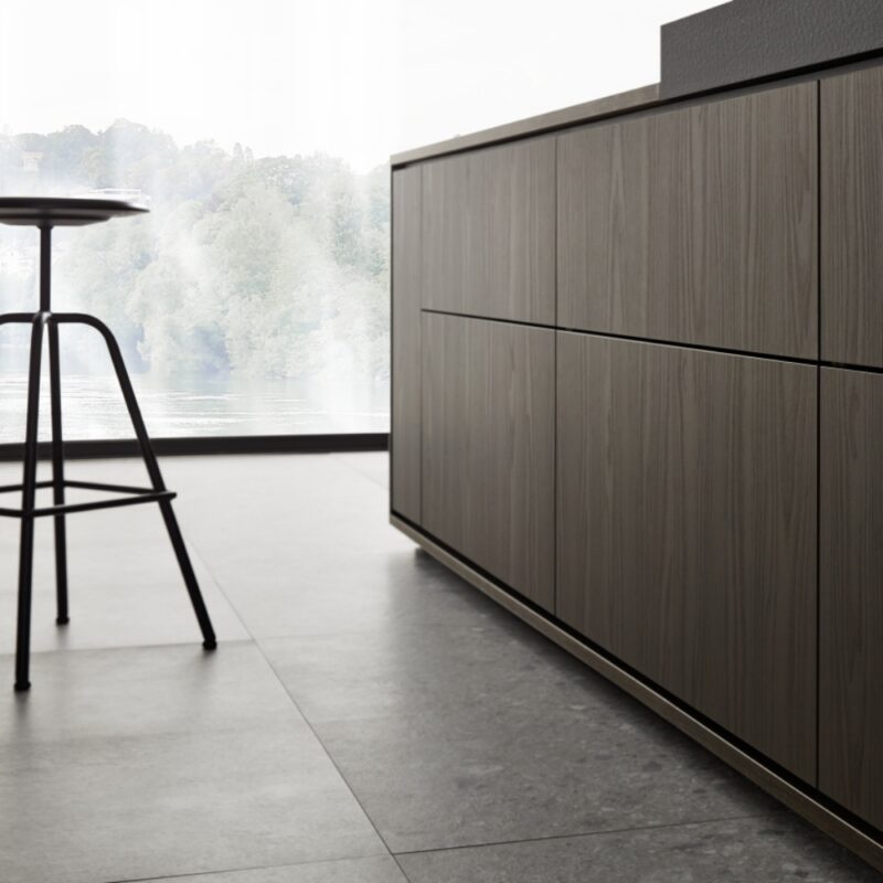 The neoBOX drawer and pull-out system brings exquisite design to the cabinet interior. The narrow side frame appeals for its simple elegance, and the anthracite finish harmonises perfectly with the kitchen’s other high-quality materials.