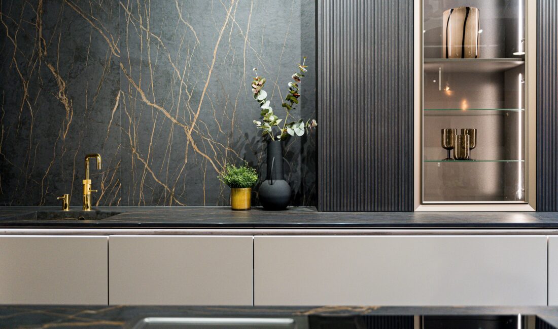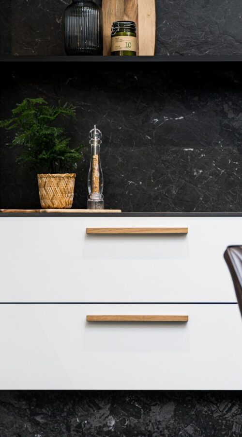 In off-white or soft-black, Flair brings undeniable wow-factor to your kitchen. Stylish stainless steel, oak or brass-look edges offer a refined aesthetic that’s captivating and functional, combined with a soft matte anti-fingerprint laminate surface – an elegant look further enhanced by our handleless, MatrixArt option.